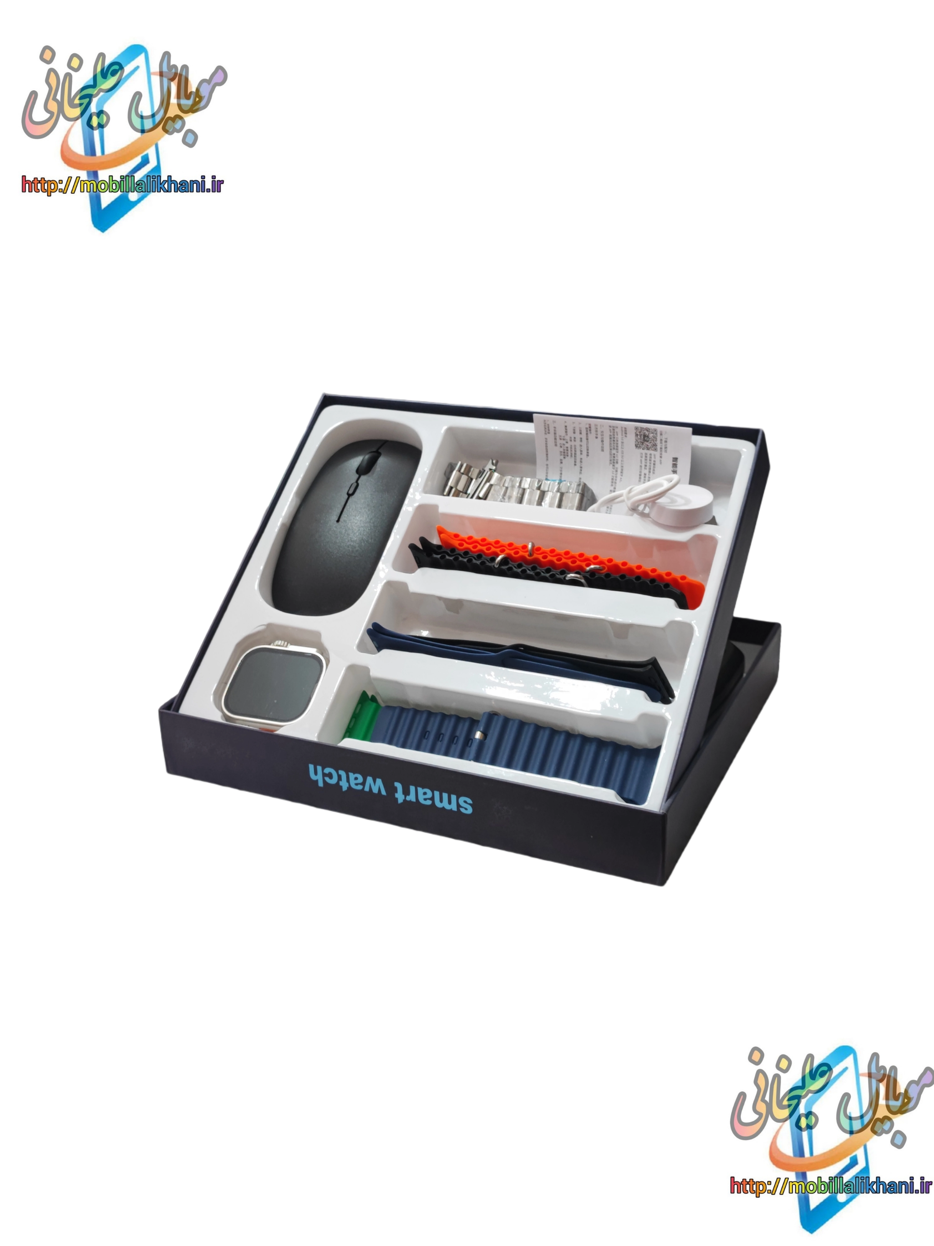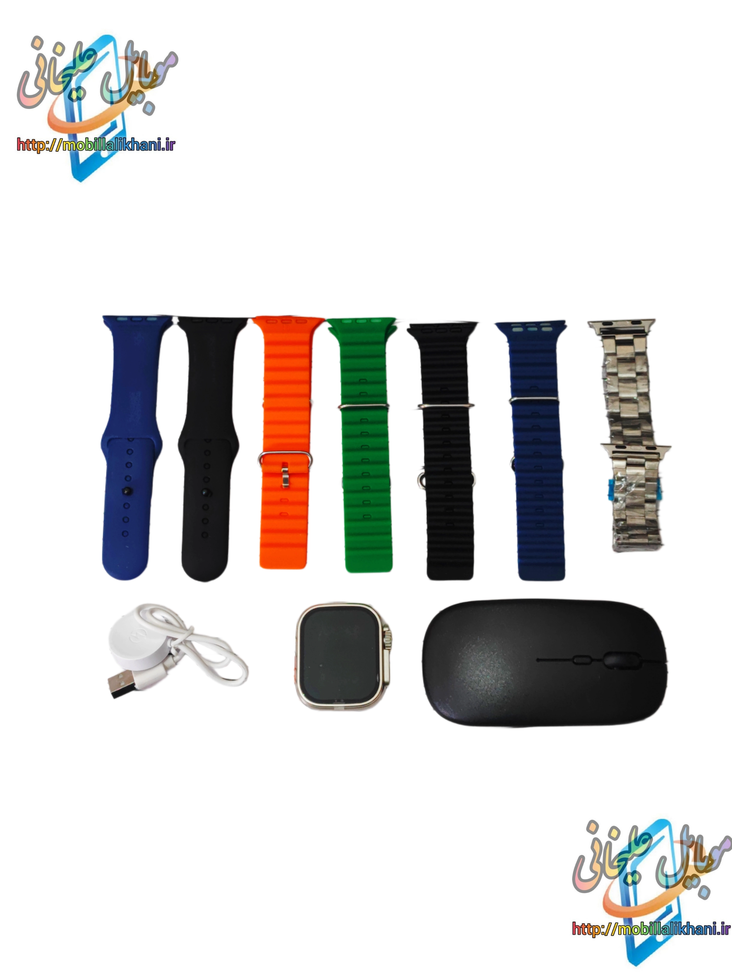 اقلام موجود در این پک ساعت Ultra2،ماوس،7عدد بندبه همراه شارژر بی سیم.